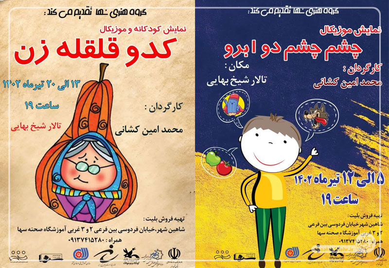 این کارگردان تئاتر ادامه داد: نمایش «چشم چشم دو ابرو» از ۵ تا ۱۲ تیر و «کدو قلقله زن» از ۱۳ تا ۲۰ تیر ساعت ۱۹ در سالن سینما تالار شیخ بهایی شاهین شهر بر روی صحنه می رود.